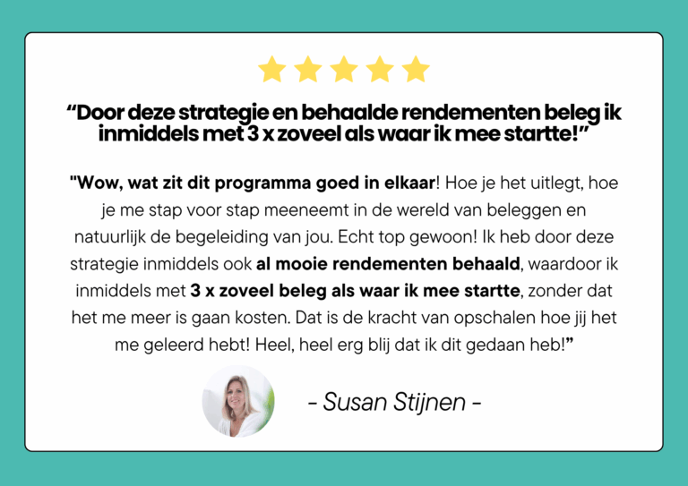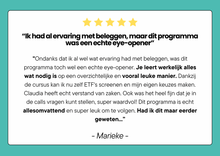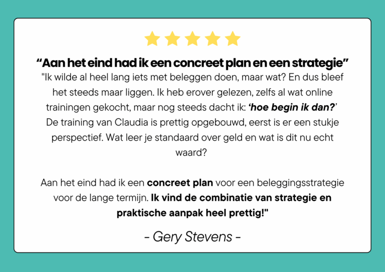 Je krijgt in dit programma GEEN persoonlijk financieel advies of beleggingsadvies! Wat je wel krijgt: je leert de concrete stappen, strategie, tools en vaardigheden waarmee je zelf leert beleggen. Je blijft altijd zelf verantwoordelijk voor de investeringen die je doet en de keuzes die je maakt. Beleg alleen met geld dat je kunt missen voor langere termijn (minimaal 10 jaar). En hou in gedachten; hoe fantastisch de rendementen in het verleden ook geweest mogen zijn, het is nooit een garantie voor de toekomst!