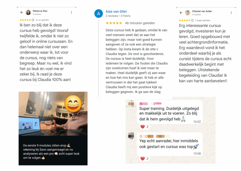 Door deze training heb ik geleerd dat ik het ook kan! Het was interessant, leerzaam, en energiek. 🔥 Mijn grootste leermoment is dat je ook met kleinere bedragen al kunt beginnen. Nu ik de strategie geleerd heb hoef ik me vanaf nu alleen nog maar aan het plan te houden. Voor iedereen die twijfelt, gewoon doen!